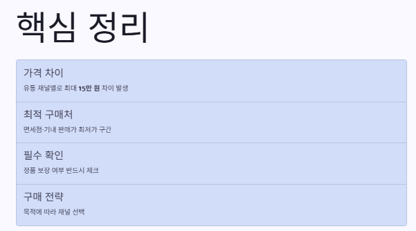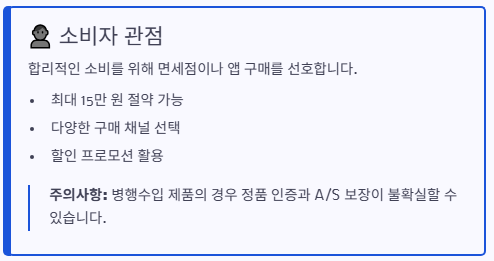 - 소비자 관점: 합리적인 소비를 위해 면세점이나 앱 구매를 선호하지만, 병행수입 제품의 경우 정품 인증·A/S 보장이 불확실합니다.