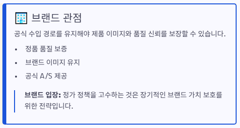 - 브랜드 관점: 공식 수입 경로를 유지해야 제품 이미지와 품질 신뢰를 보장할 수 있습니다. 따라서 정가 정책을 고수하는 이유가 있습니다.