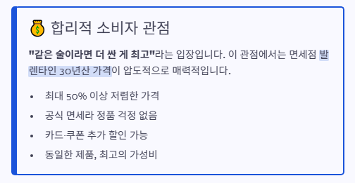 “같은 술이라면 더 싼 게 최고”라는 입장입니다. 이 관점에서는 면세점 발렌타인 30년산 가격이 압도적으로 매력적입니다. 공식 면세라 정품 걱정도 적습니다. - 보수적·안정성 관점