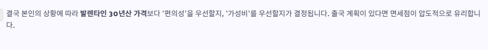 결국 본인의 상황에 따라 발렌타인 30년산 가격보다 ‘편의성’을 우선할지, ‘가성비’를 우선할지가 결정됩니다.