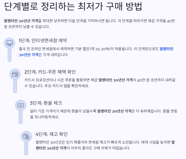 카드사 프로모션이나 시즌 쿠폰을 활용하면 체감 발렌타인 30년산 가격이 40만 원 초반까지 내려갈 수 있습니다.