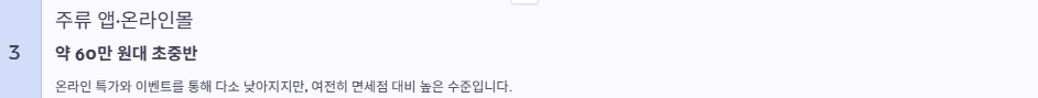 - 주류 앱·온라인몰: 약 60만 원대 초중반