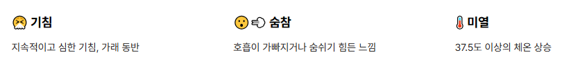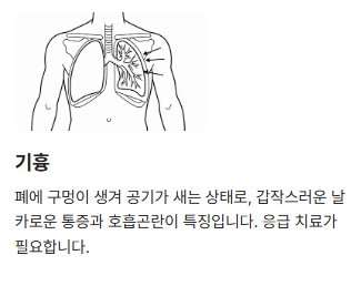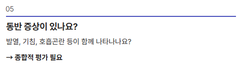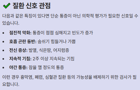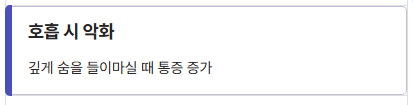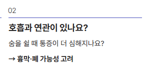 - 숨 쉴 때 통증이 더 심해지나요? → 흉막·폐 가능성