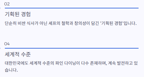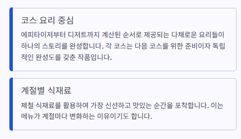 - 음식, 서비스, 분위기, 스토리까지 포함한 종합적인 미식 경험입니다.