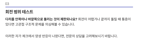 - 다리 회전이 제한되나요? → 관절 구조 문제 가능성