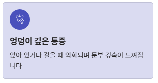 - 엉덩이 깊은 통증: 앉아 있거나 걸을 때 악화