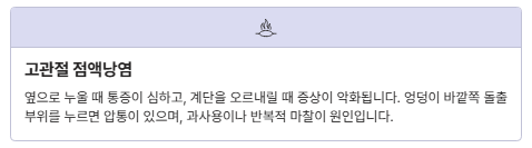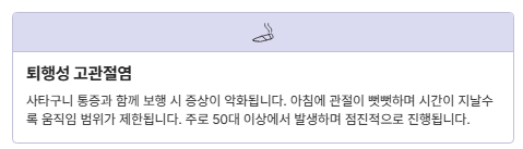 - 뻣뻣함: 아침이나 오래 앉은 뒤 첫 움직임이 힘듦