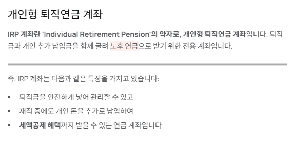 IRP 계좌란 ‘개인형 퇴직연금(Individual Retirement Pension)’ 계좌입니다.