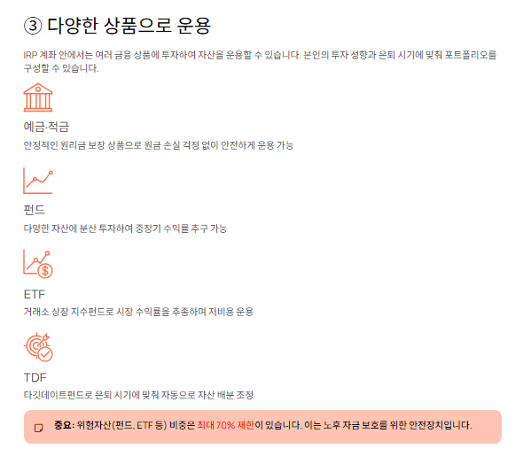 IRP 계좌 안에서는 다음과 같은 상품에 투자할 수 있습니다.