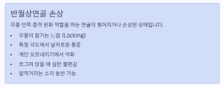 - 퇴행성 관절염, 반월상연골 손상과 동반 잦음