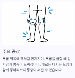 - 무릎 관절액이 뒤쪽으로 차면서 혹처럼 만져짐