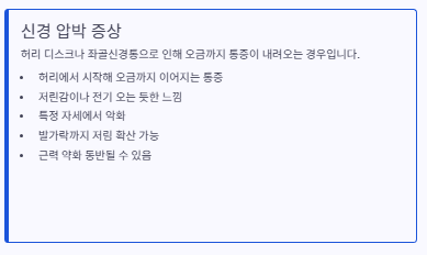 - 허리 문제(디스크 등)로 통증이 오금까지 내려옴