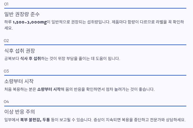 - 일반 권장량: 하루 1,500~3,000mg